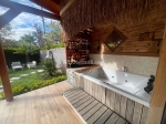 Barbekü, şezlong, masa ve sandalyeler ve salıncak bulunmaktadır.