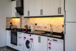Geniş, Ferah ve Modern Dizayn Edilmiş Amerikan Mutfak, Buzdolabı, Bulaşık Makinesi, Çamaşır Makinesi, Fırın, 4’lü Ocak (ankastre), Mikrodalga Fırın, Elektrikli Su Isıtıcı, Tost Makinesi, Tava & Tencere vb. Mutfak Ekipmanları, 4 Kişilik Yemek Takımı bulunmaktadır.