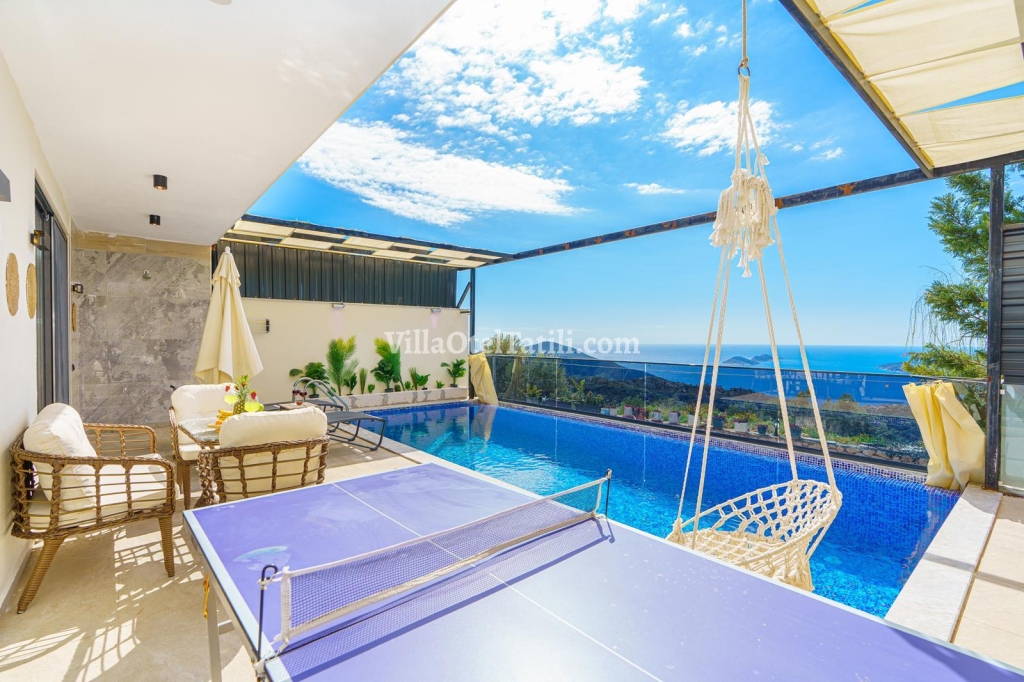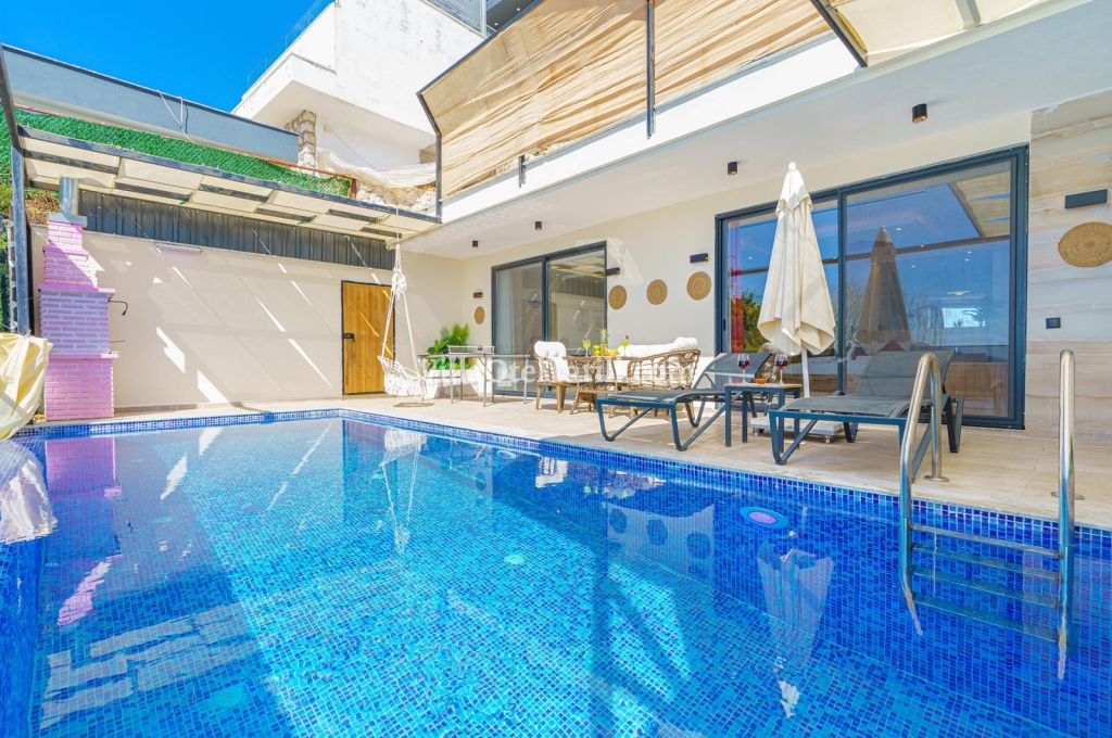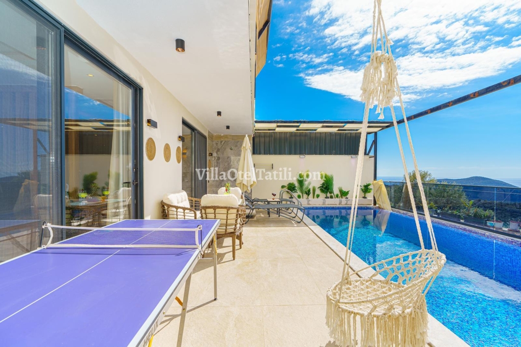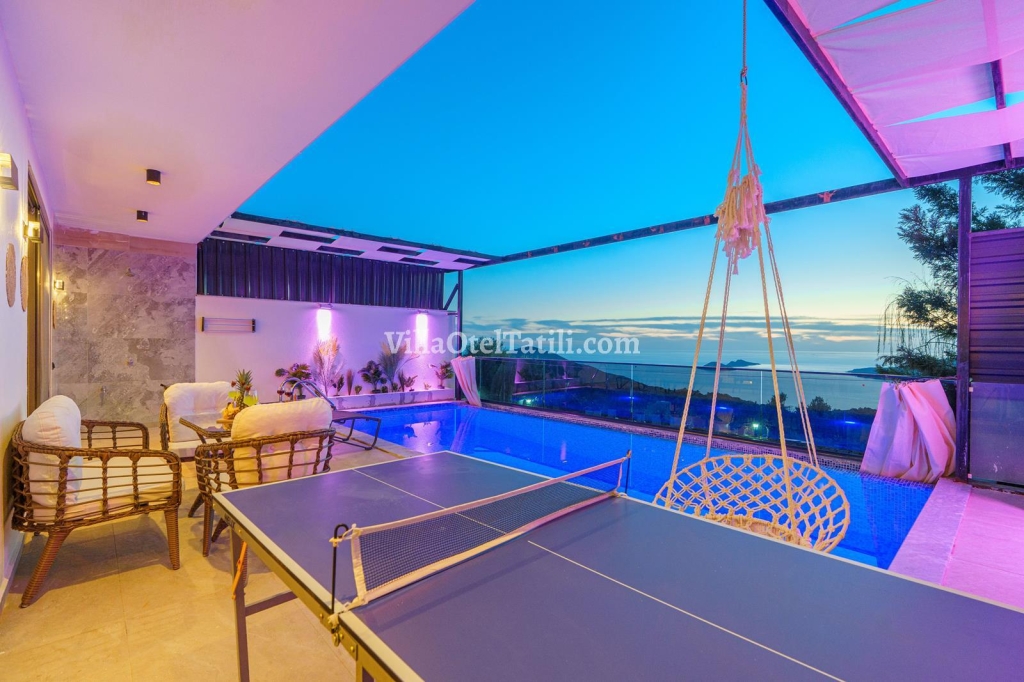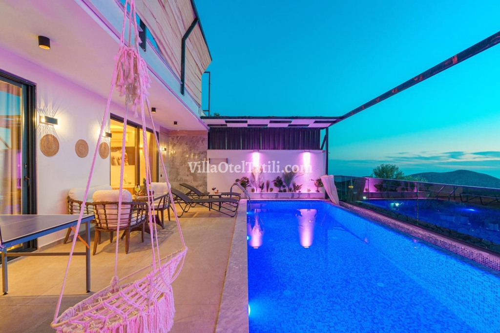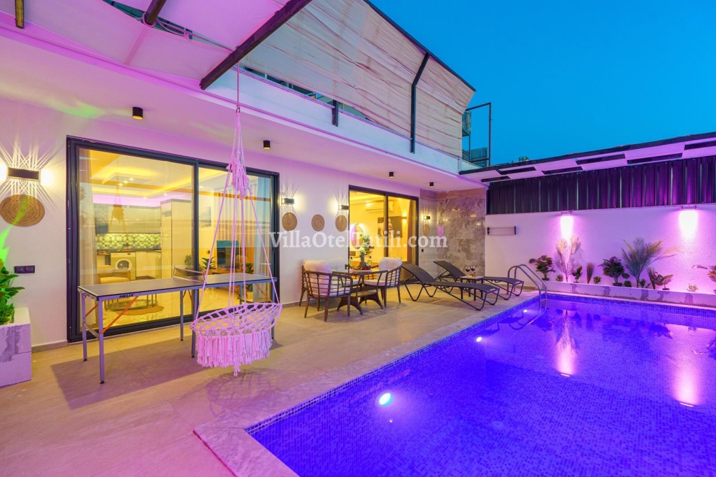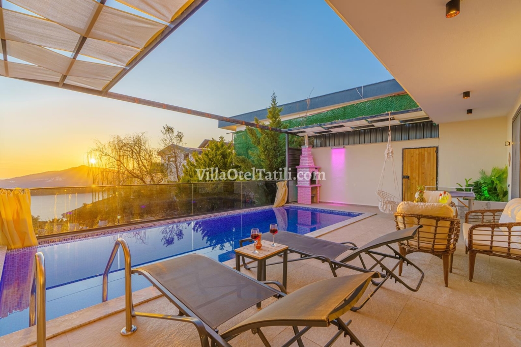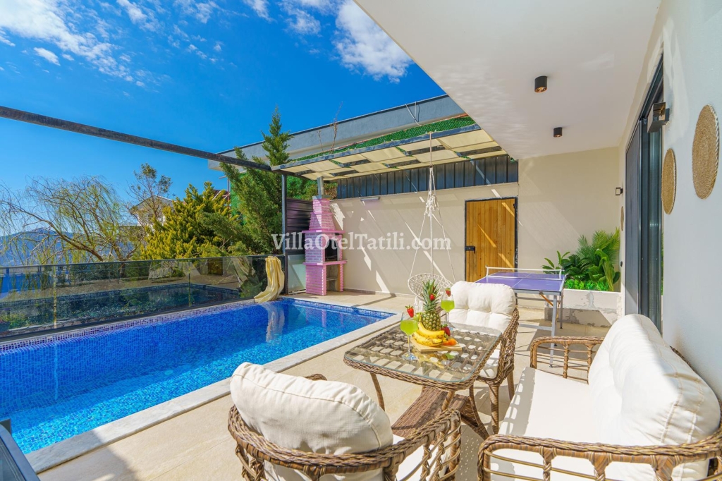 Villa İlkim bahçesinde korunaklı özel yüzme havuzu, şezlonglar ve şemsiye, yemek masası ve sandalyeler, salıncak ve taş barbekü yer almaktadır.