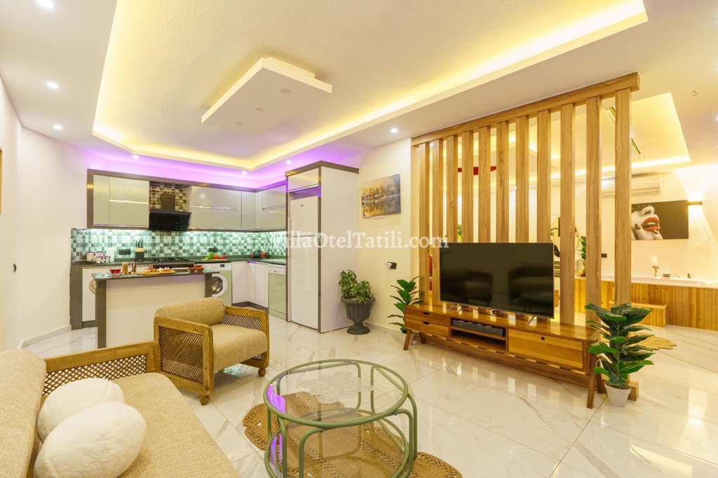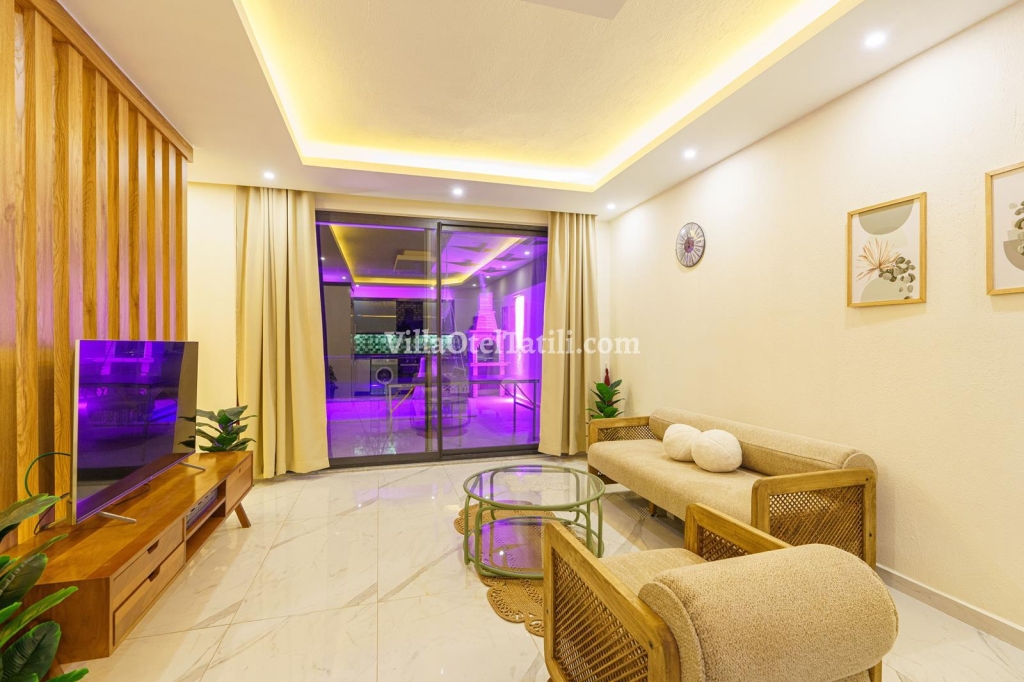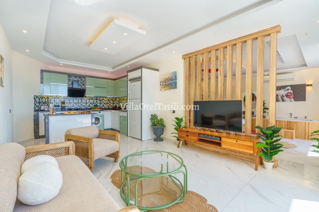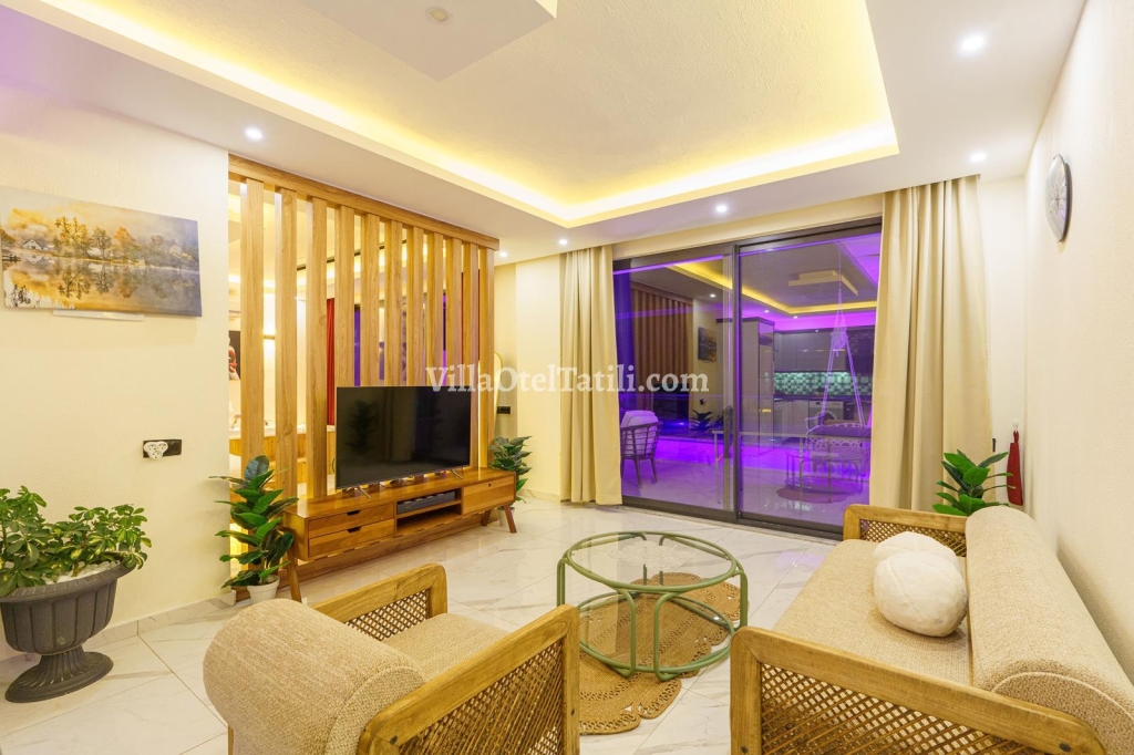 Salon içerisinde modern oturma grubu, uydu alıcı, LCD TV, internet için modem, klima ve havuz terasına çıkış bulunmaktadır.