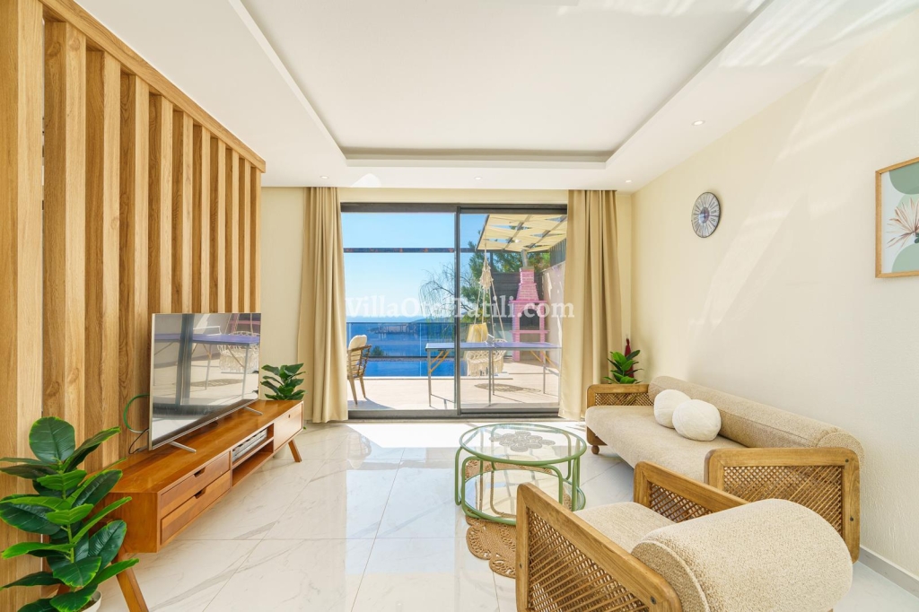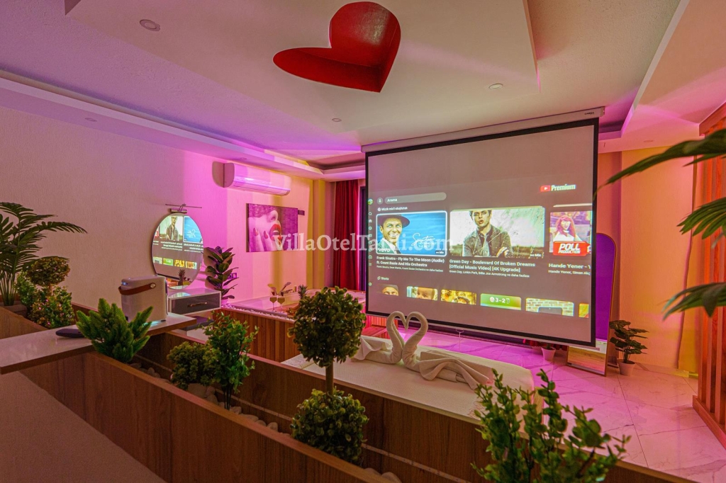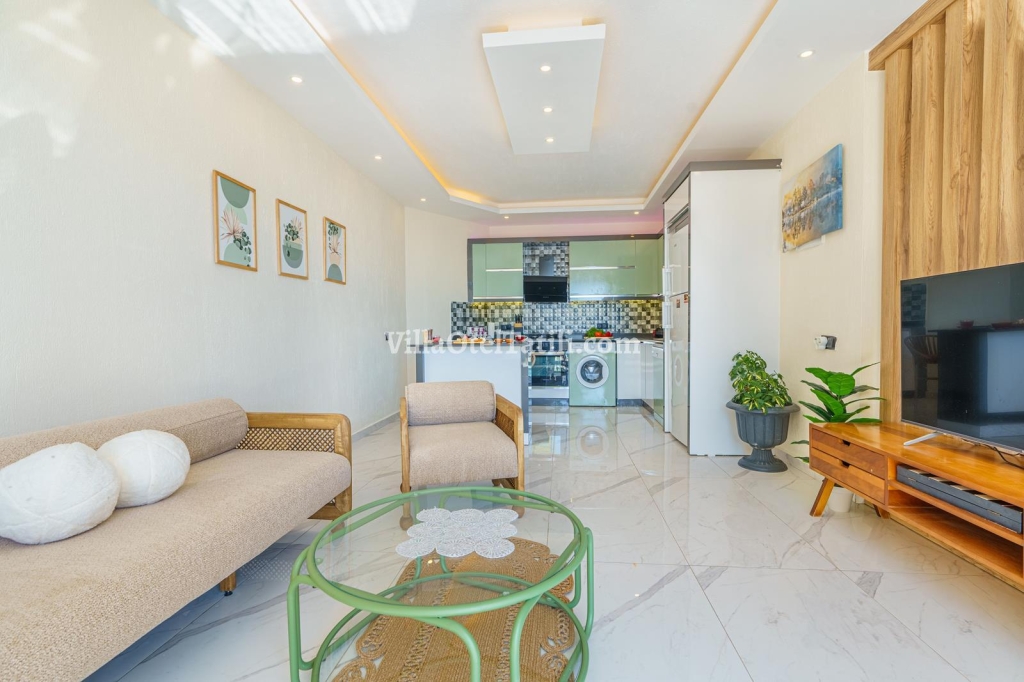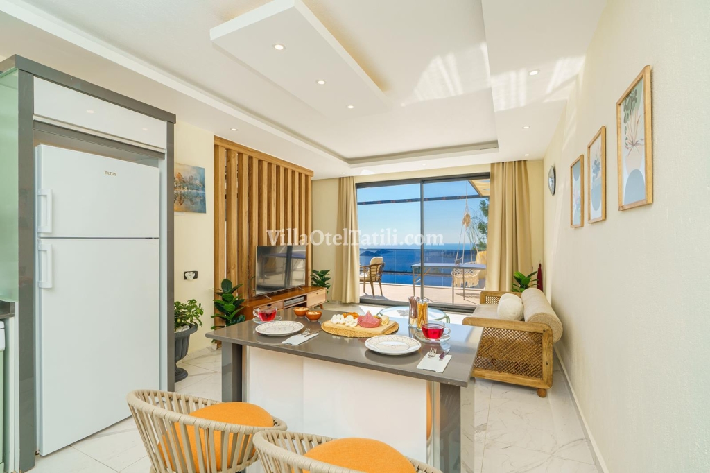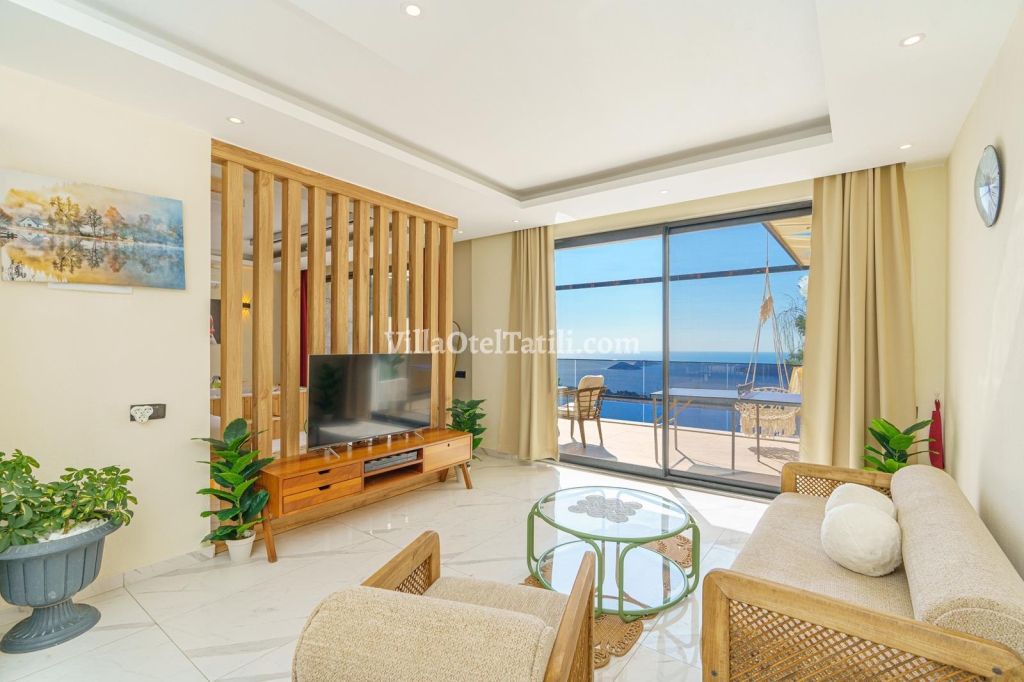 Salon içerisinde modern oturma grubu, uydu alıcı, LCD TV, internet için modem, klima ve havuz terasına çıkış bulunmaktadır.