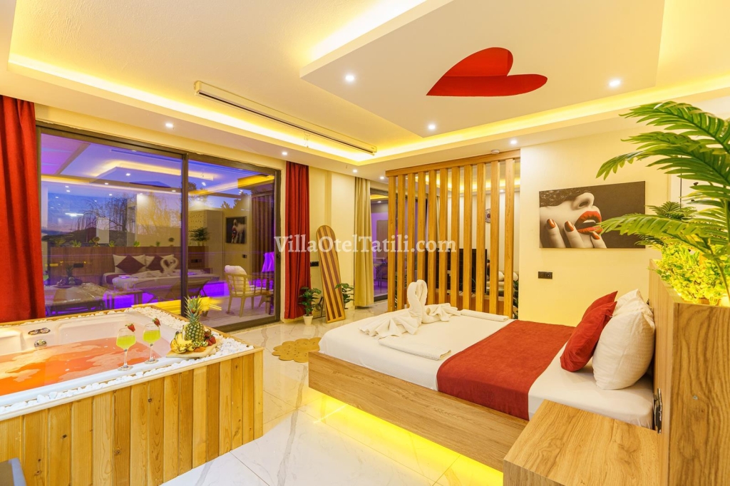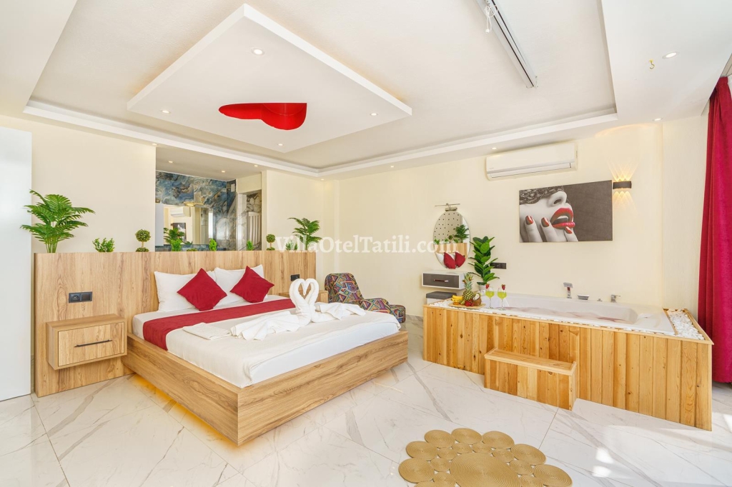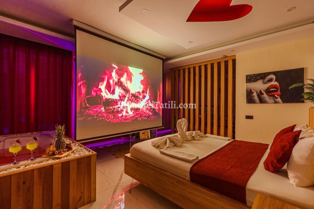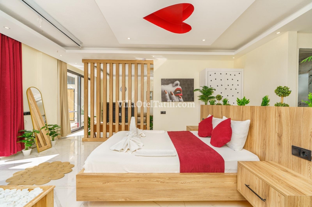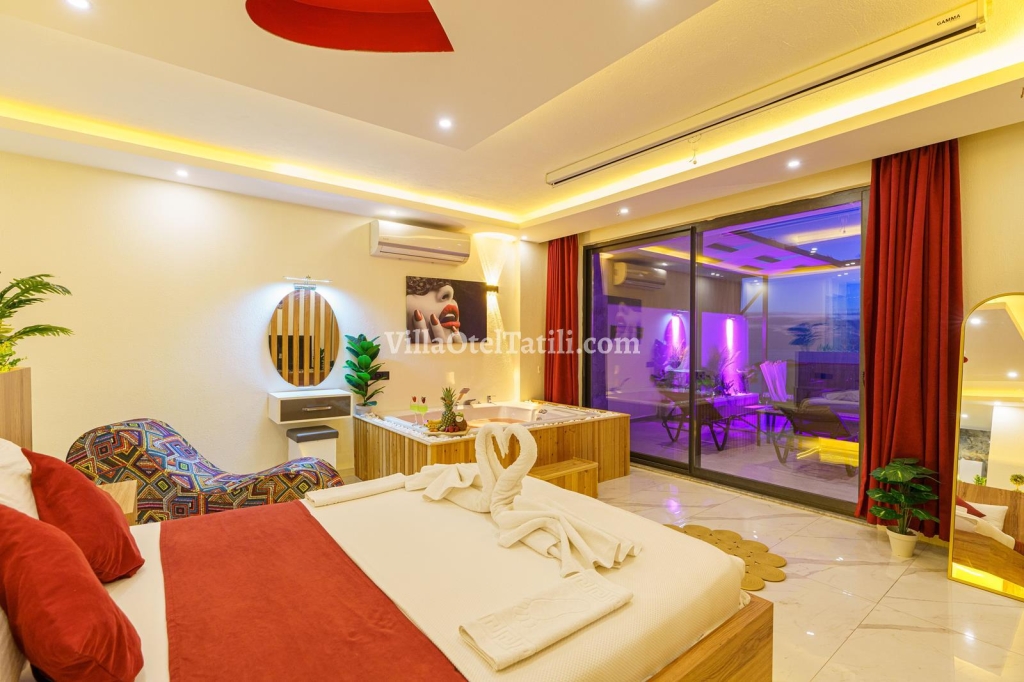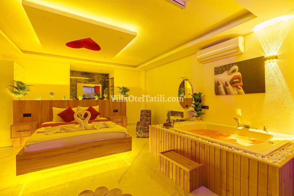 1. Yatak Odası: 1 adet çift kişilik yatak, komidin, makyaj masası, elbise dolabı, klima, jakuzi ve banyo/tuvalet bulunmaktadır.