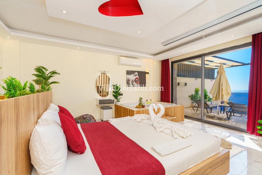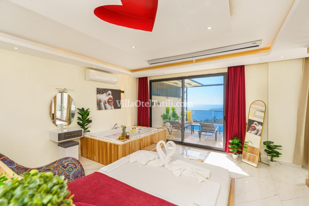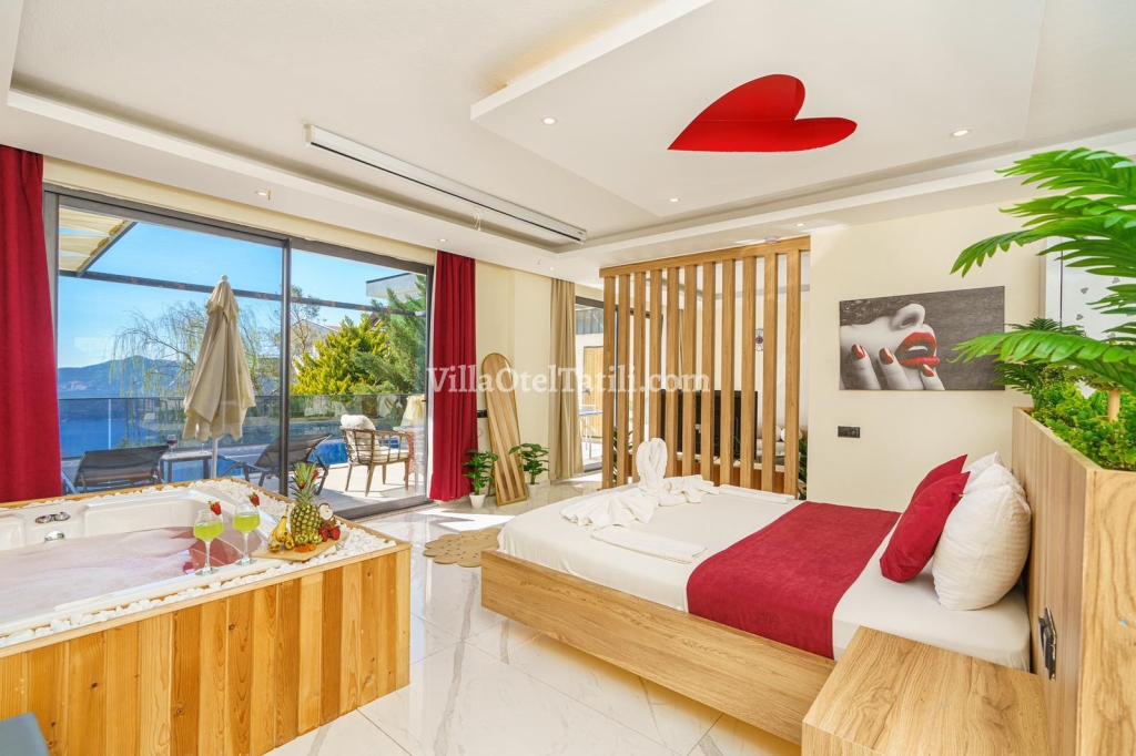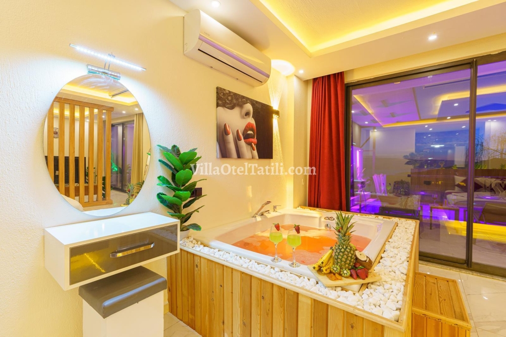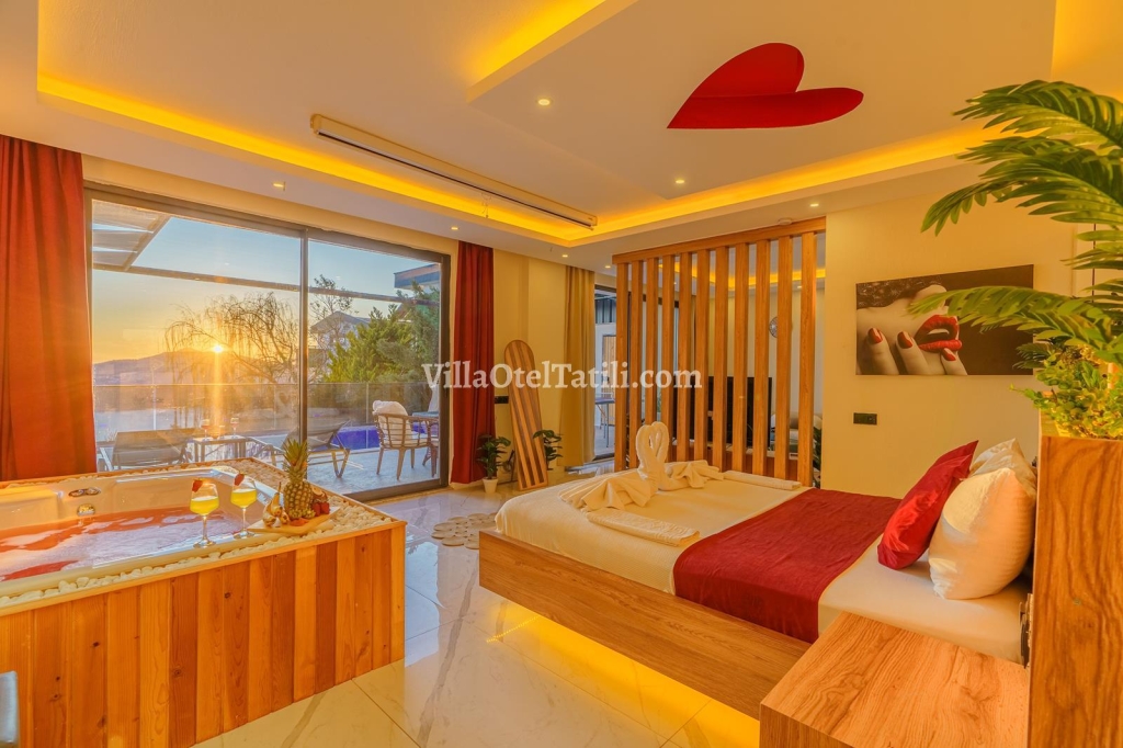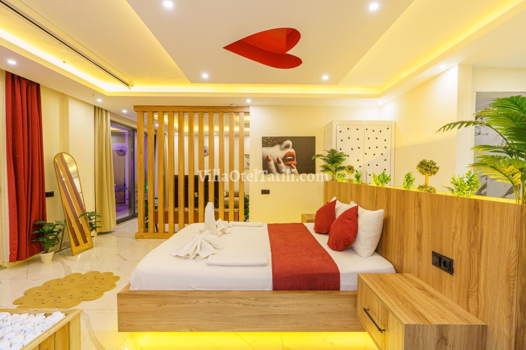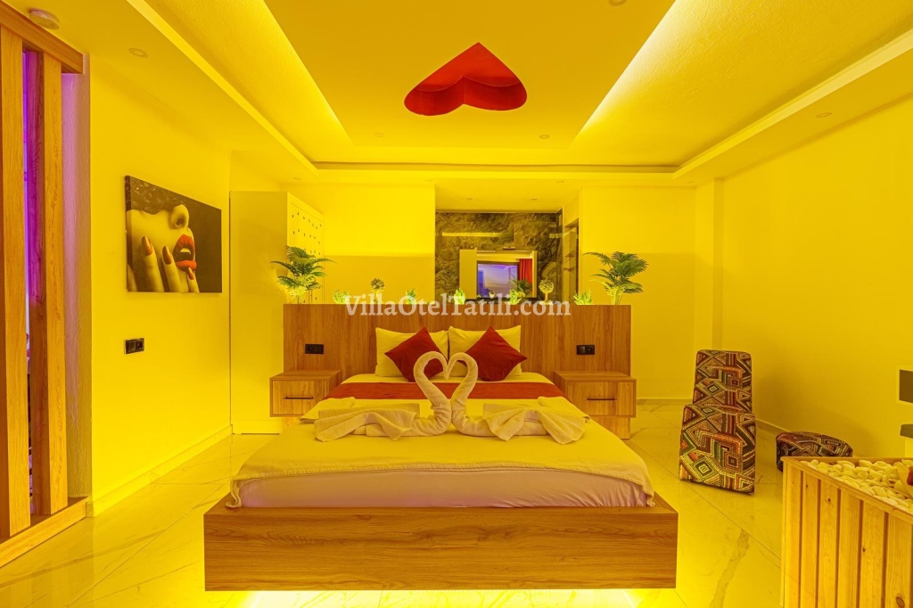 1. Yatak Odası: 1 adet çift kişilik yatak, komidin, makyaj masası, elbise dolabı, klima, jakuzi ve banyo/tuvalet bulunmaktadır.