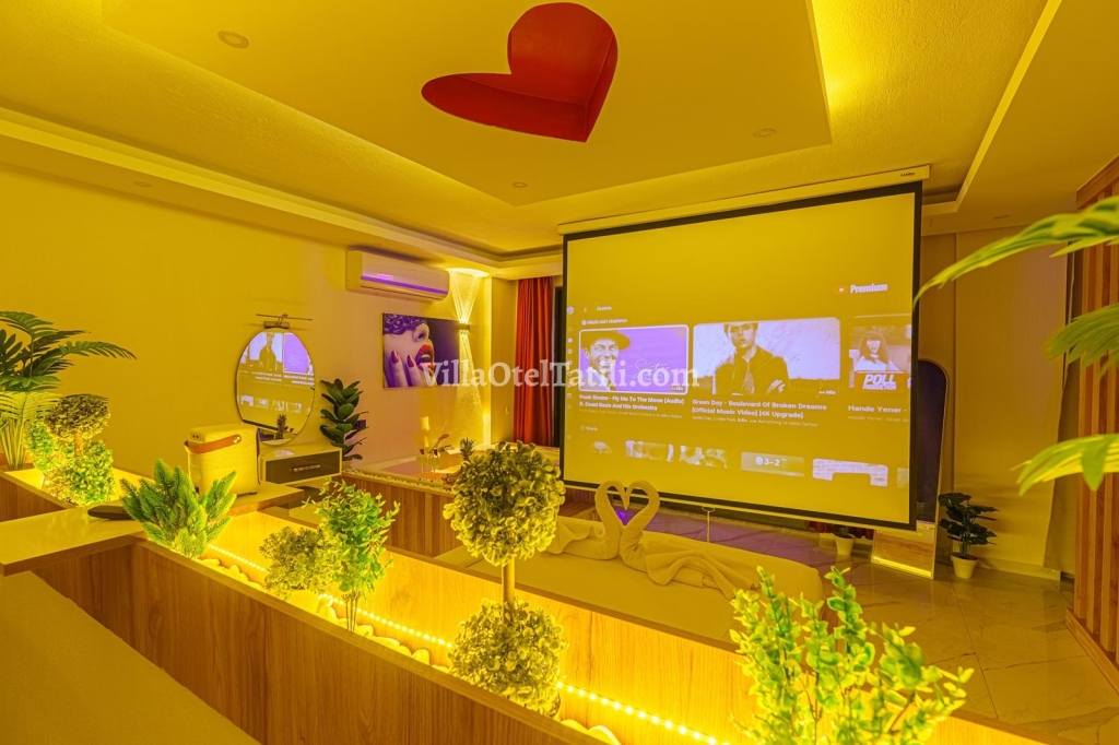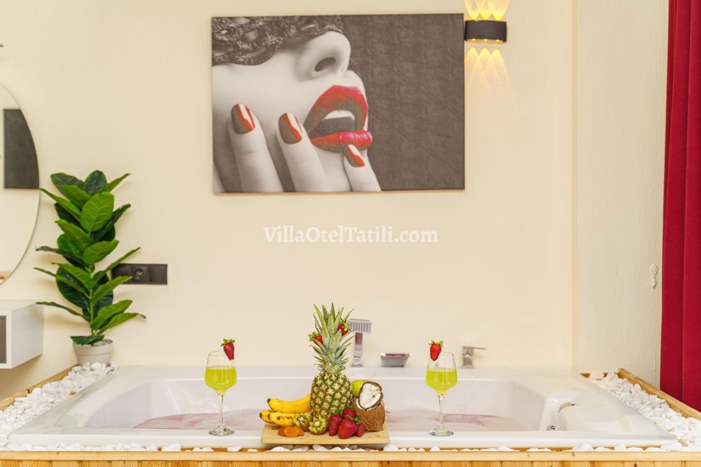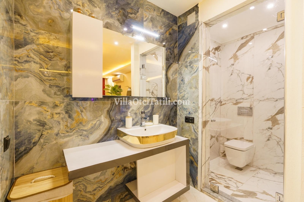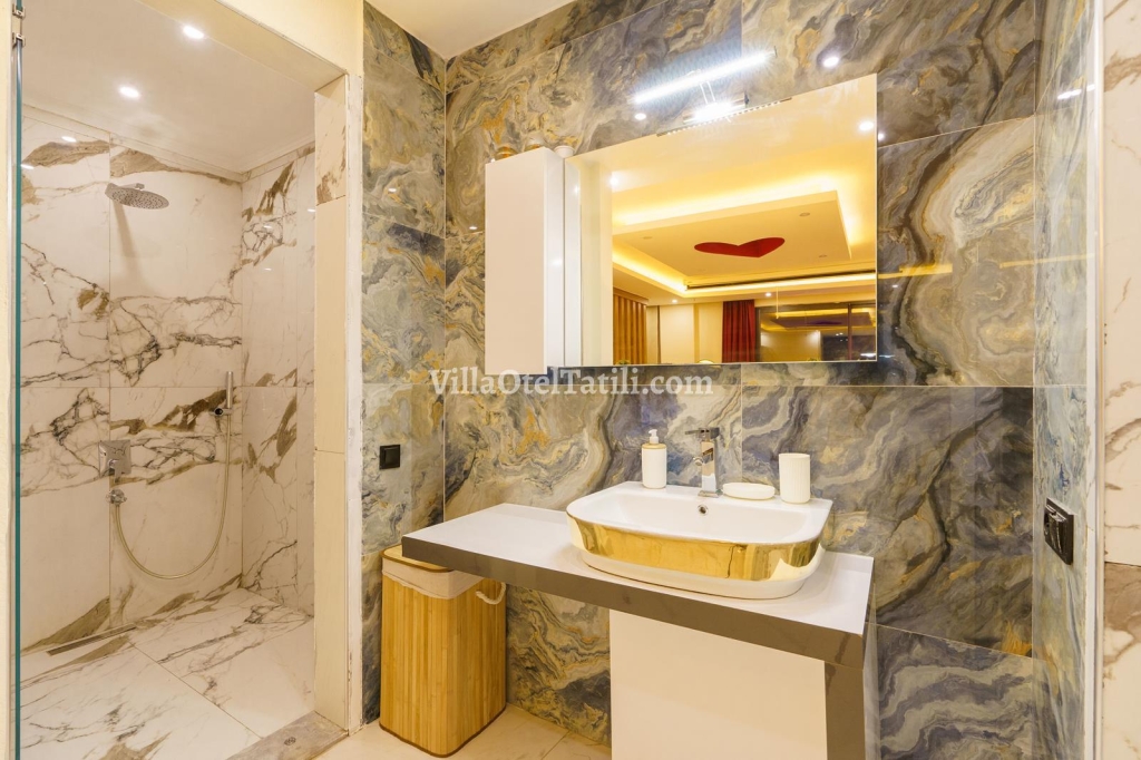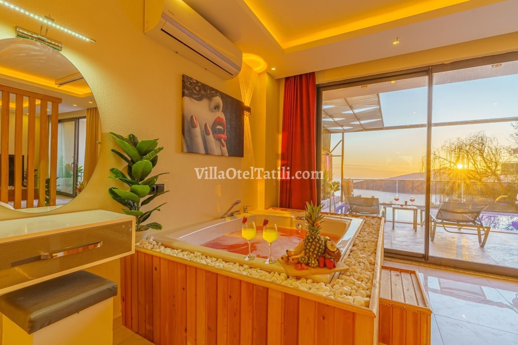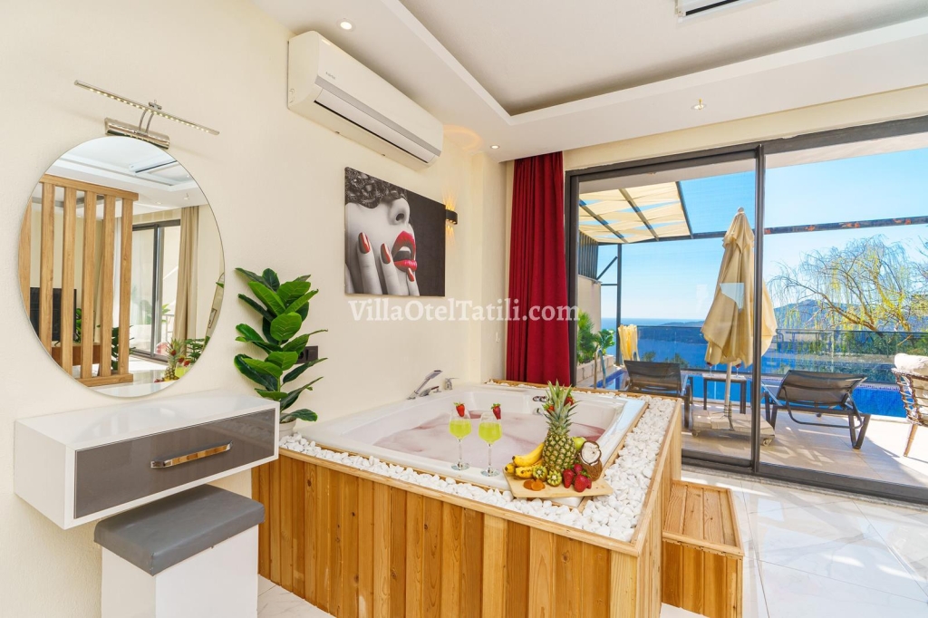 1. Yatak Odası: 1 adet çift kişilik yatak, komidin, makyaj masası, elbise dolabı, klima, jakuzi ve banyo/tuvalet bulunmaktadır.