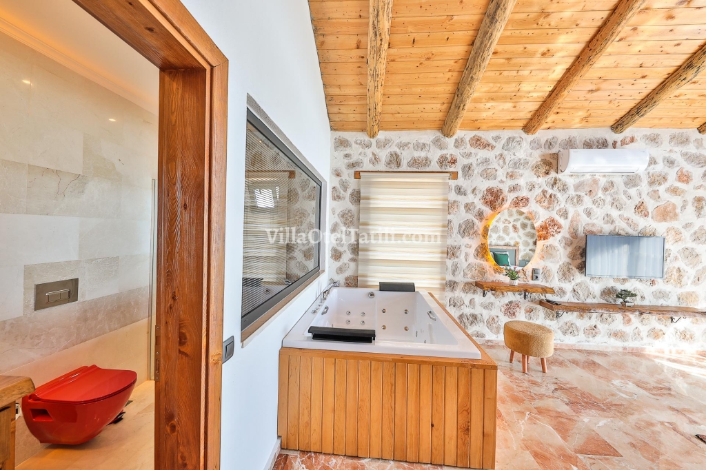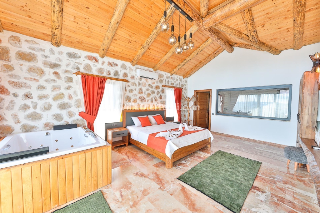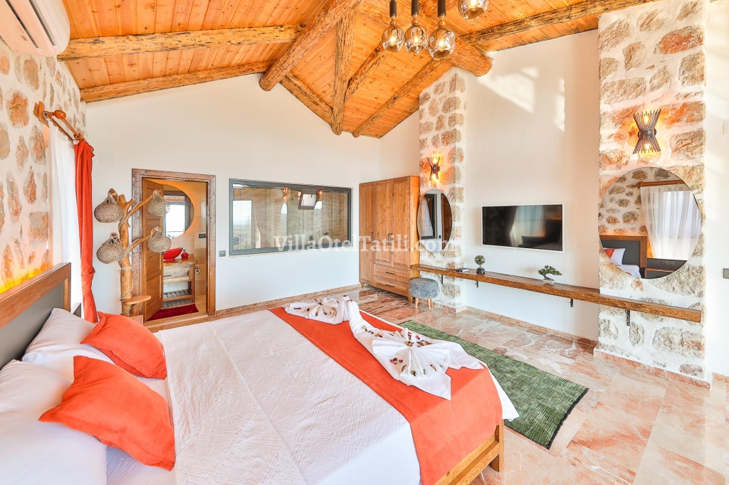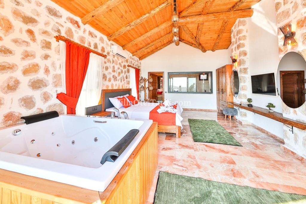 1. Yatak Odası: 1 tane Çift kişilik yatak, klima, jakuzi, komodin, elbise dolabı, makyaj masası, tv. banyo ve tuvalet bulunmaktadır.