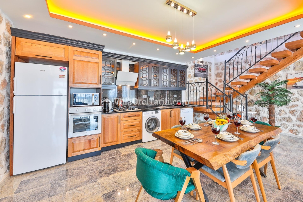 Buzdolabı, bulaşık makinası, fırın, 4'lü ocak, elektrikli su ısıtıcı (kettle), yemek masası, yemek takımları, çatal ve bıçak takımları, tencere ve tava takımları, bardaklar bulunmaktadır.